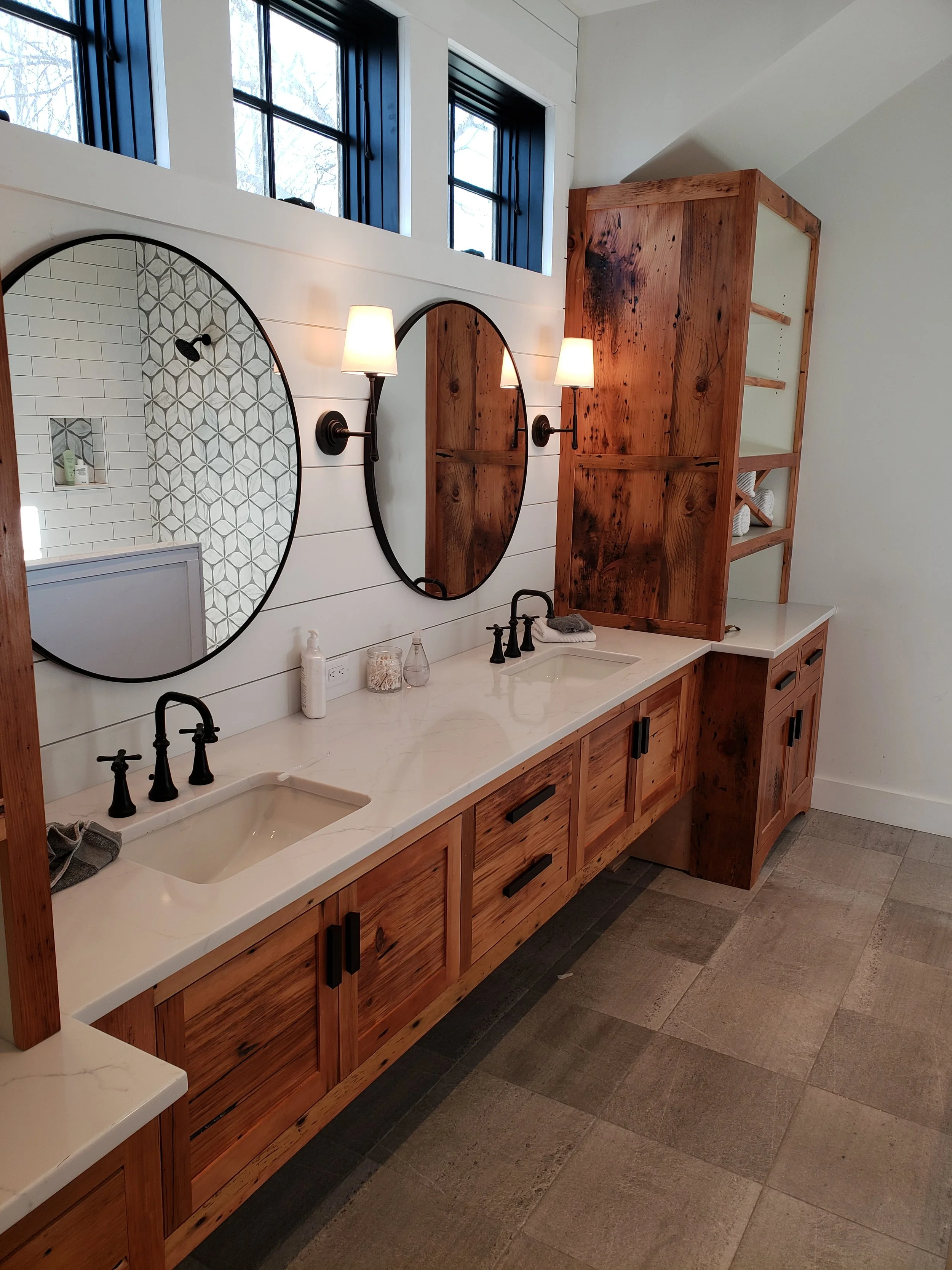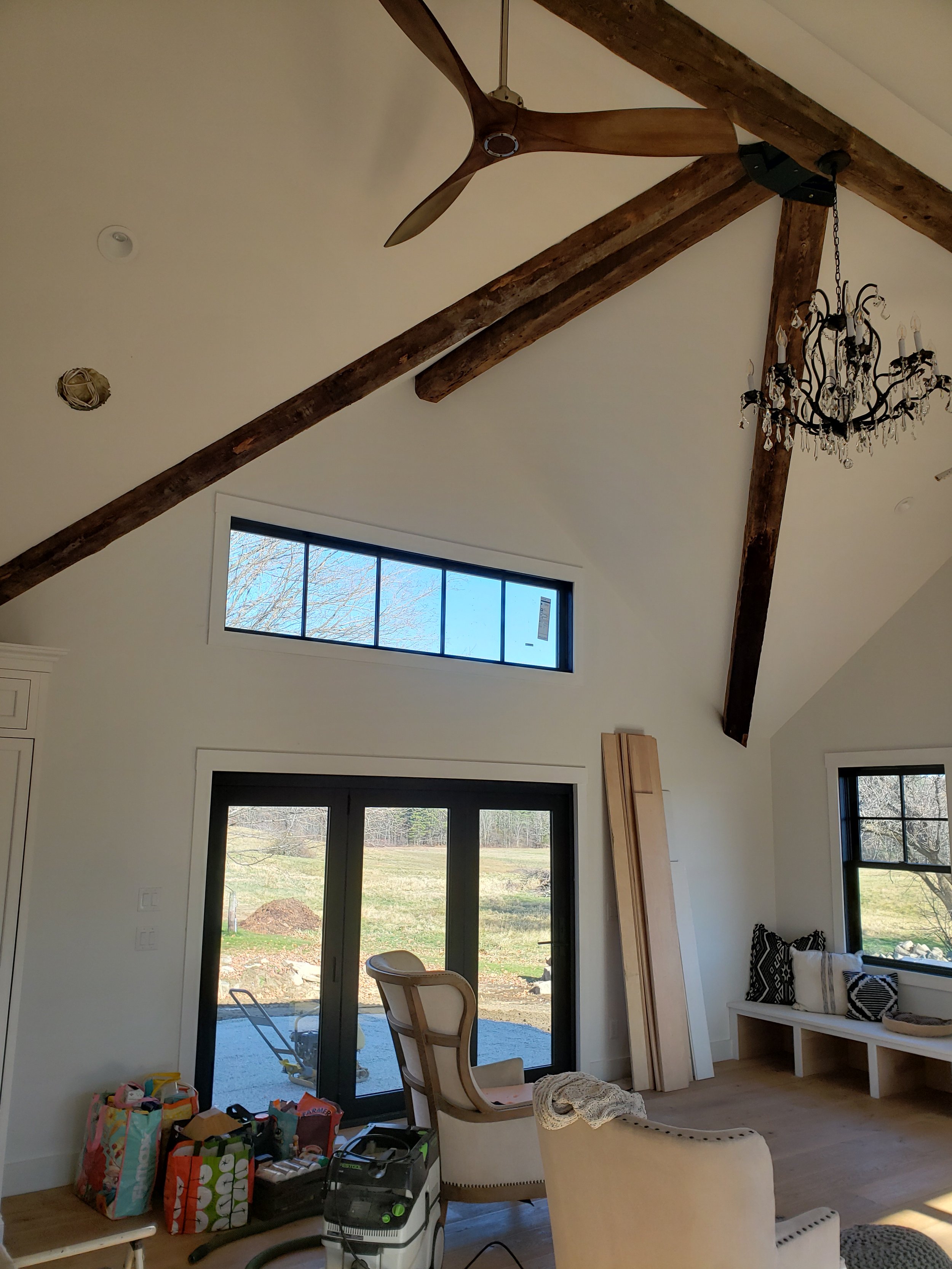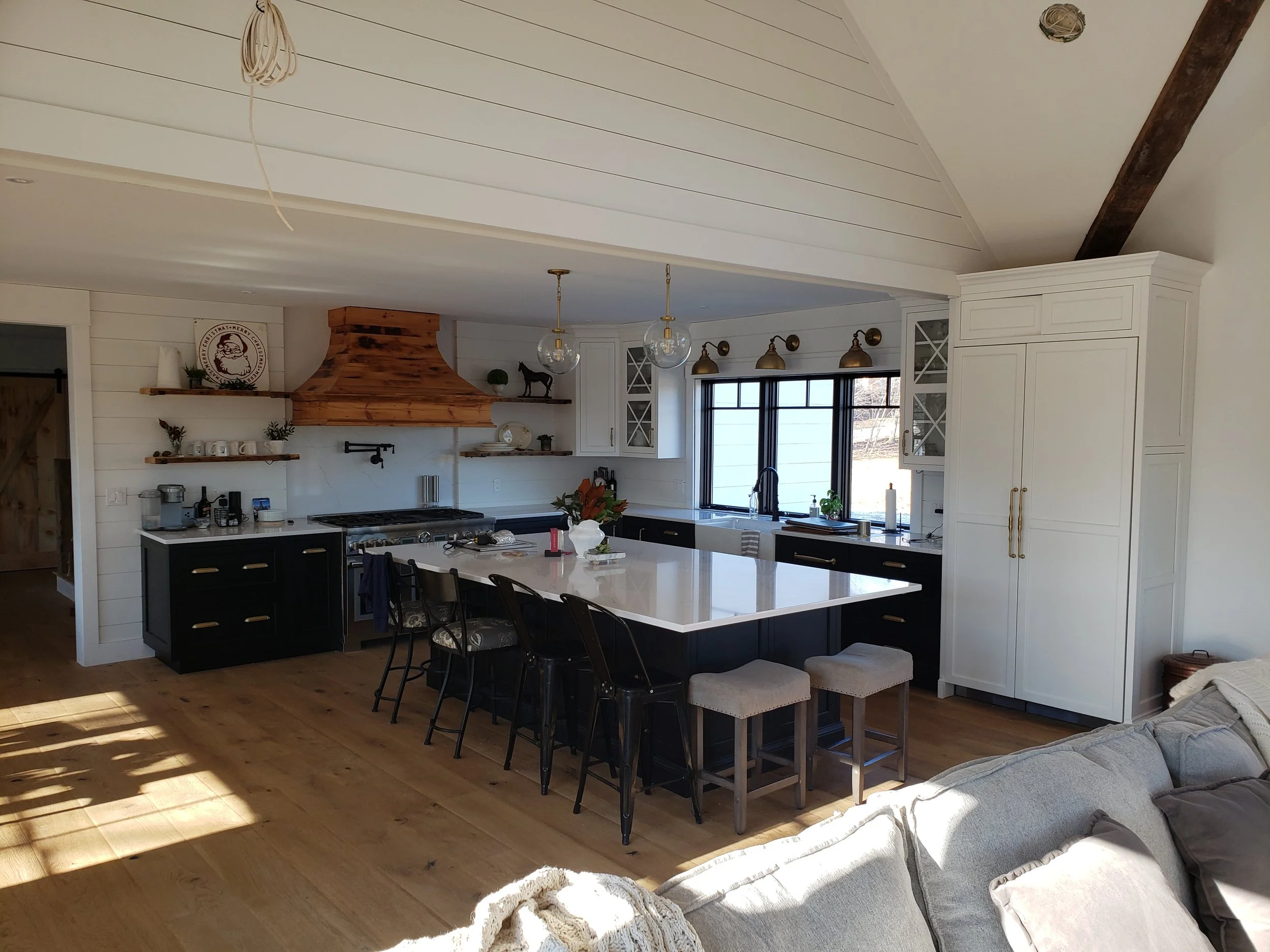 THIS PROJECT TOOK MANY BLIND TURNS AS WE ENCOUNTERED THE UNEXPECTED (OR TO BE EXPECTED IN A BUILDING OF THIS AGE WITH NUMBEROUS ADDITIONS OVER A CENTURY PLUS). BUT IN TH END WITH THE HELP OF SO MANY SUBCONTRACTORS AND TRADES WE FINISHED ON A HIGH NOTE. EVERYTHING IN THIS ENVELOPE IS CUSTOM. FROM THE RECLAIMED FLOOR BOARDS (BURN MARKS AND ALL) WHICH WERE TRANSFORMED INTO THE CURVED STOVE HOOD AND PRIMARY VANITY, TO THE CEILING HEIGHT IN THE GREAT ROOM, WHITE OAK FLOORS, CUSTOM BUILT DOORS, ETC. THIS WAS A PROJECT TO REMEMBER.
