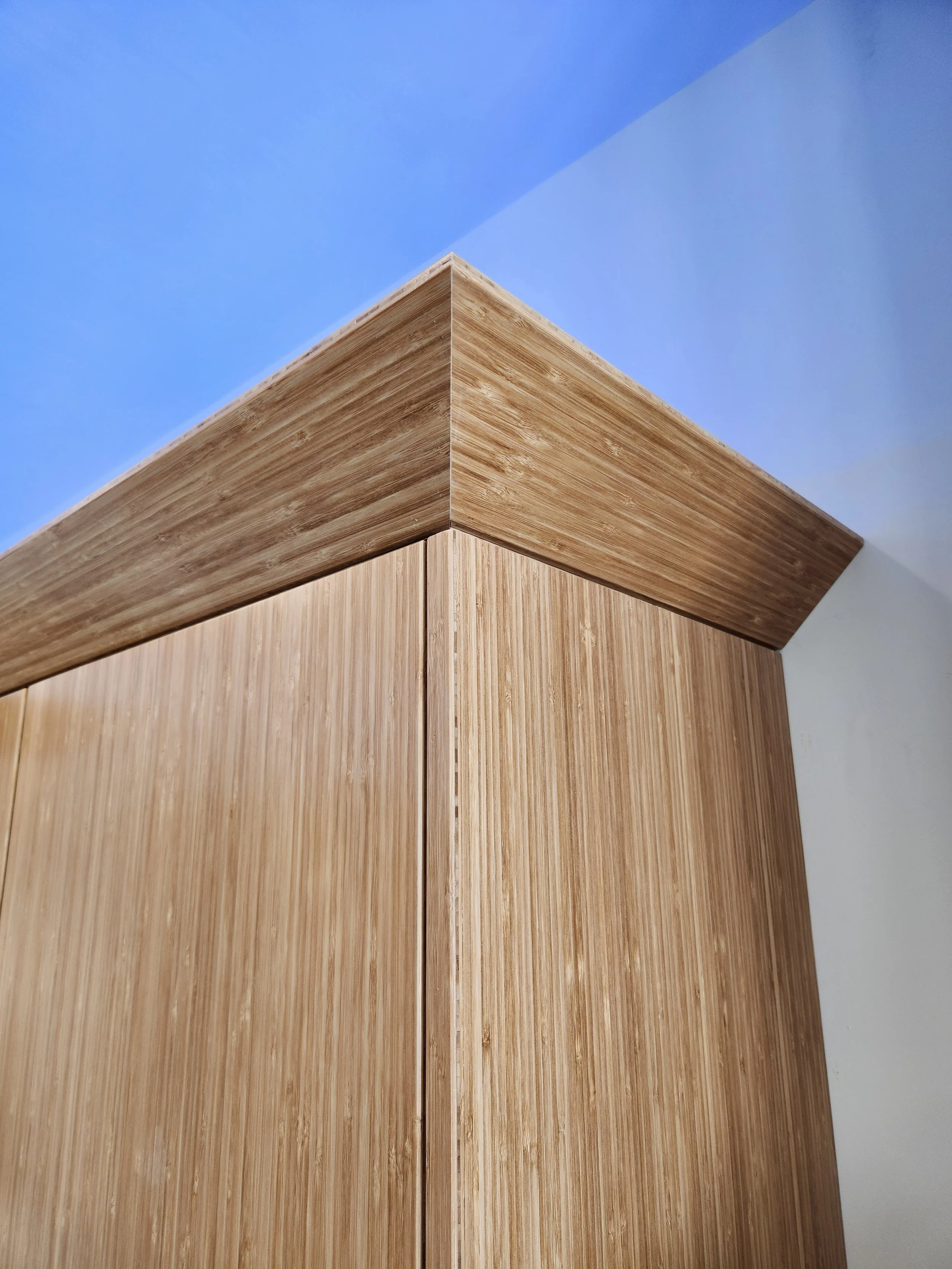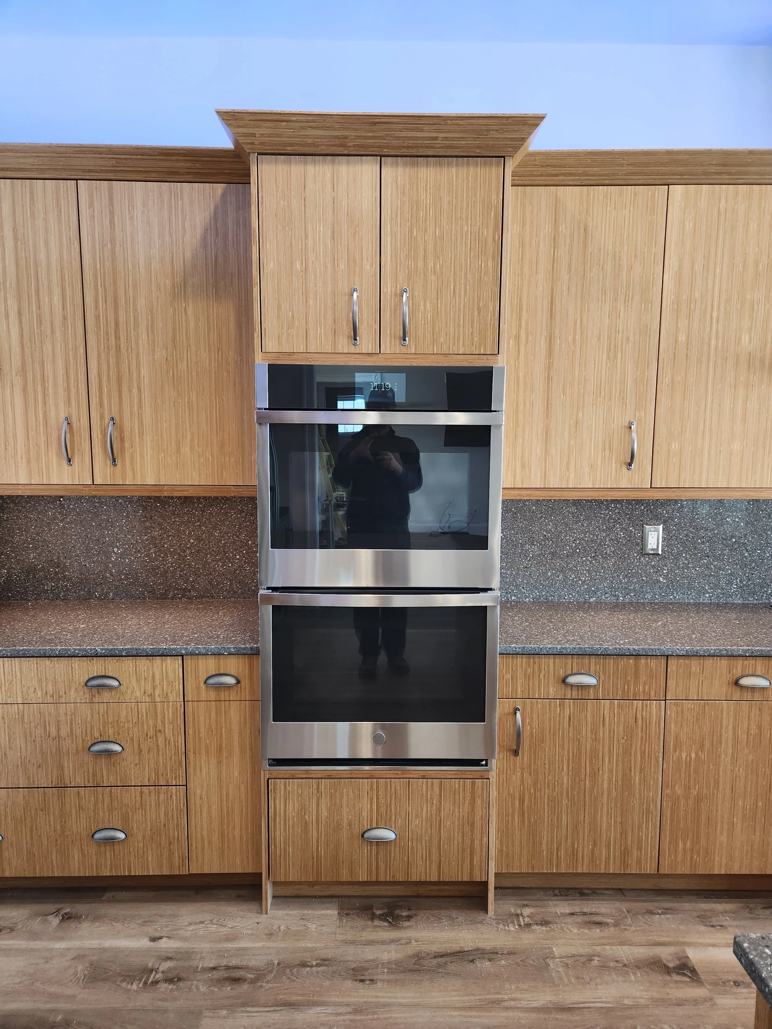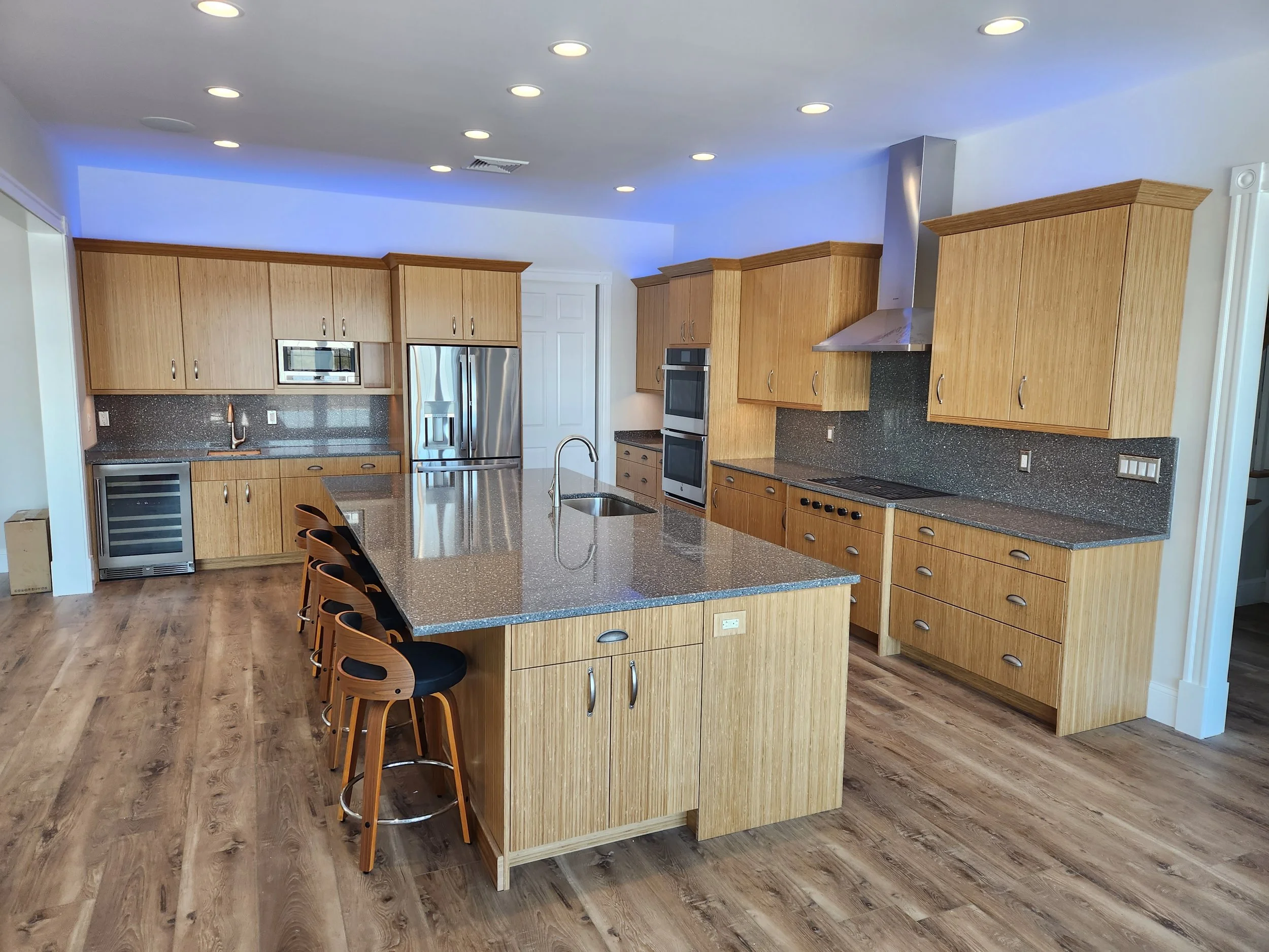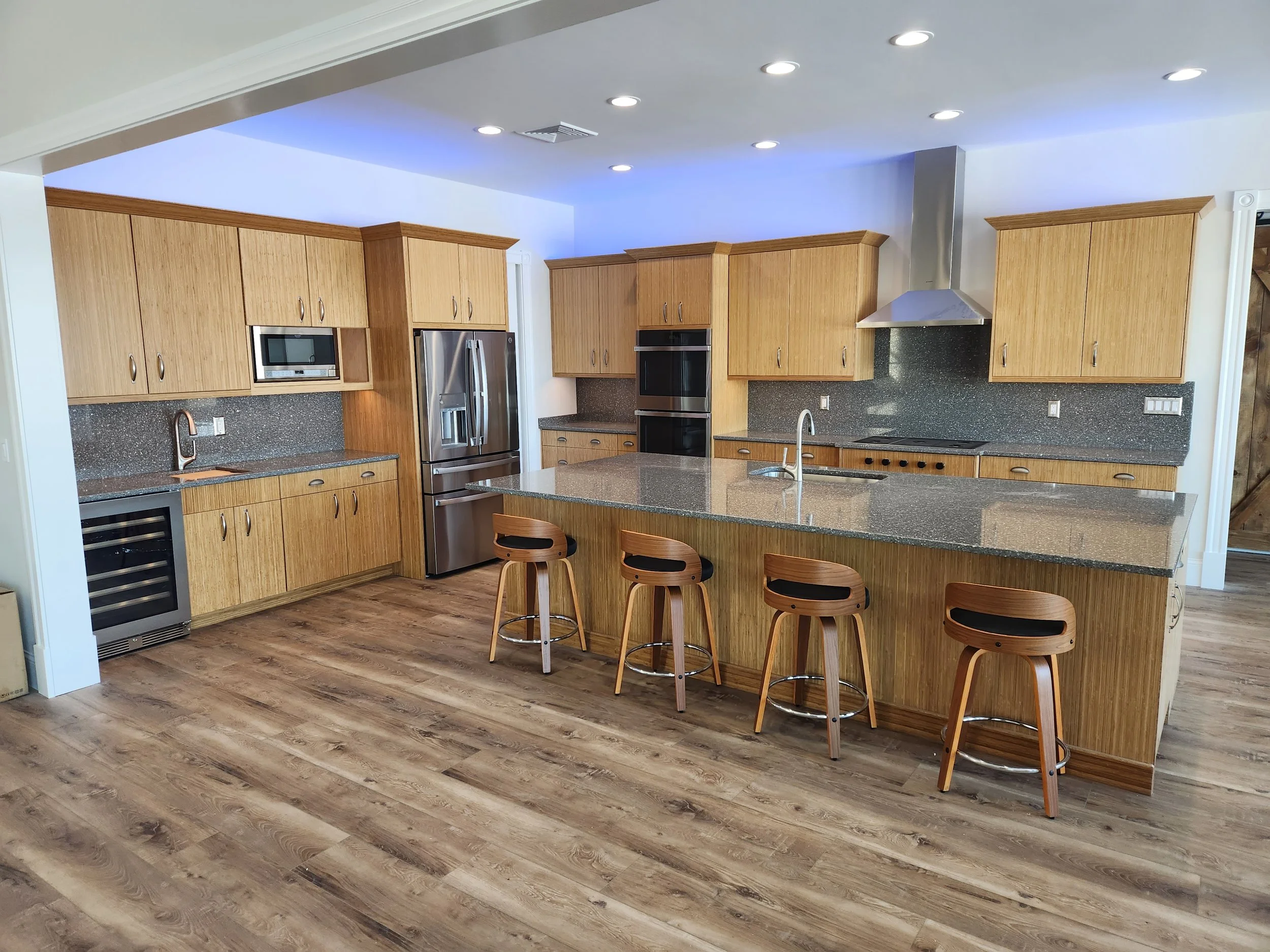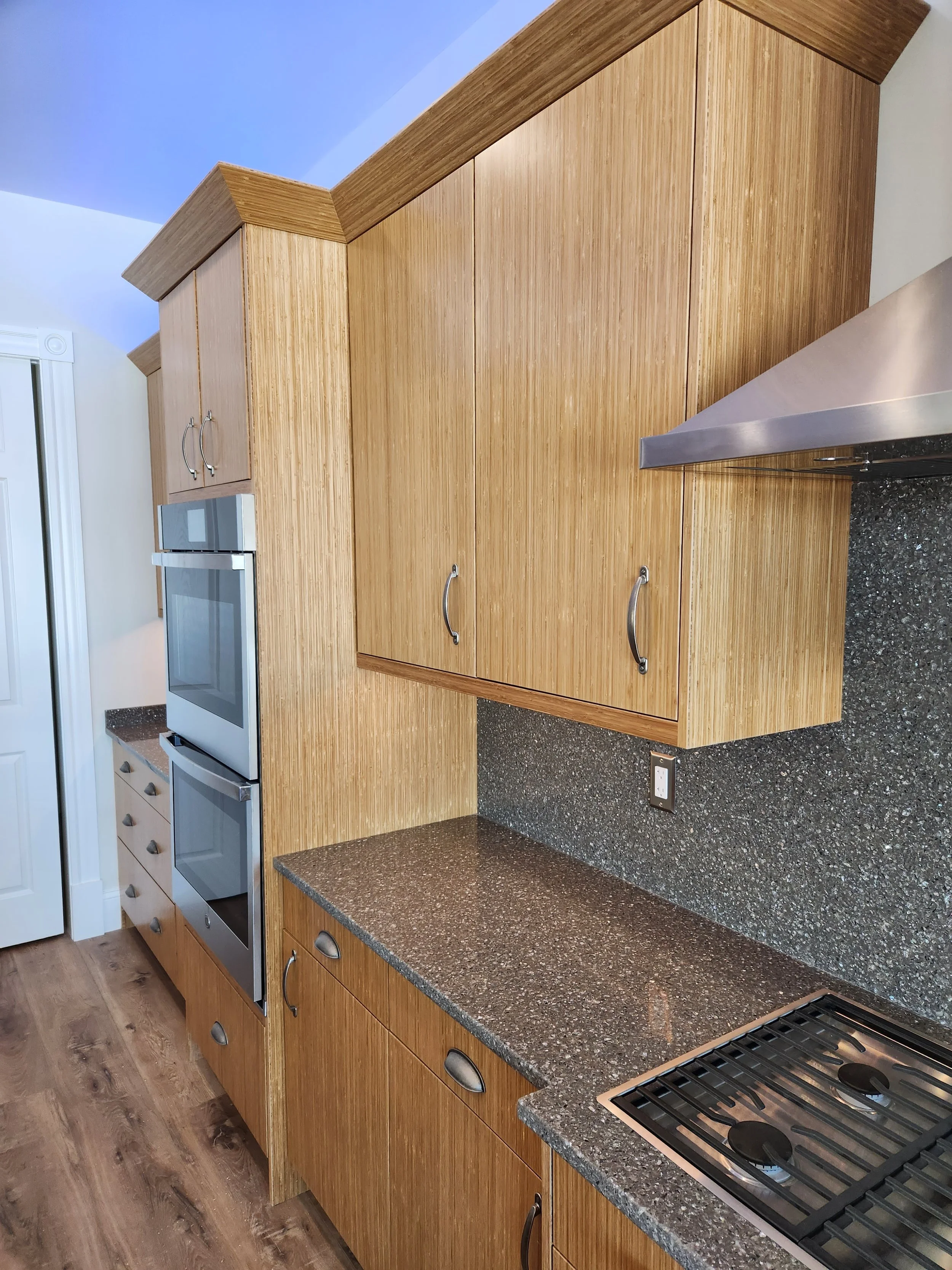 COMPRISED OF FLAT FRONT, SLAB CARAMELIZED BAMBOO WITH GRAIN MATCHED DOORS AND DRAWER FRONTS FROM FLOOR TO UPPERS. THE ISLAND IS LARGER THAN LIFE AND REQUIRED WHAT WE REFER TO AS A “SUPER SLAB”! FULL HEIGHT BACKSPLASH TIES THE COUNTERTOPS TO THE UPPER CABINETS NICELY.