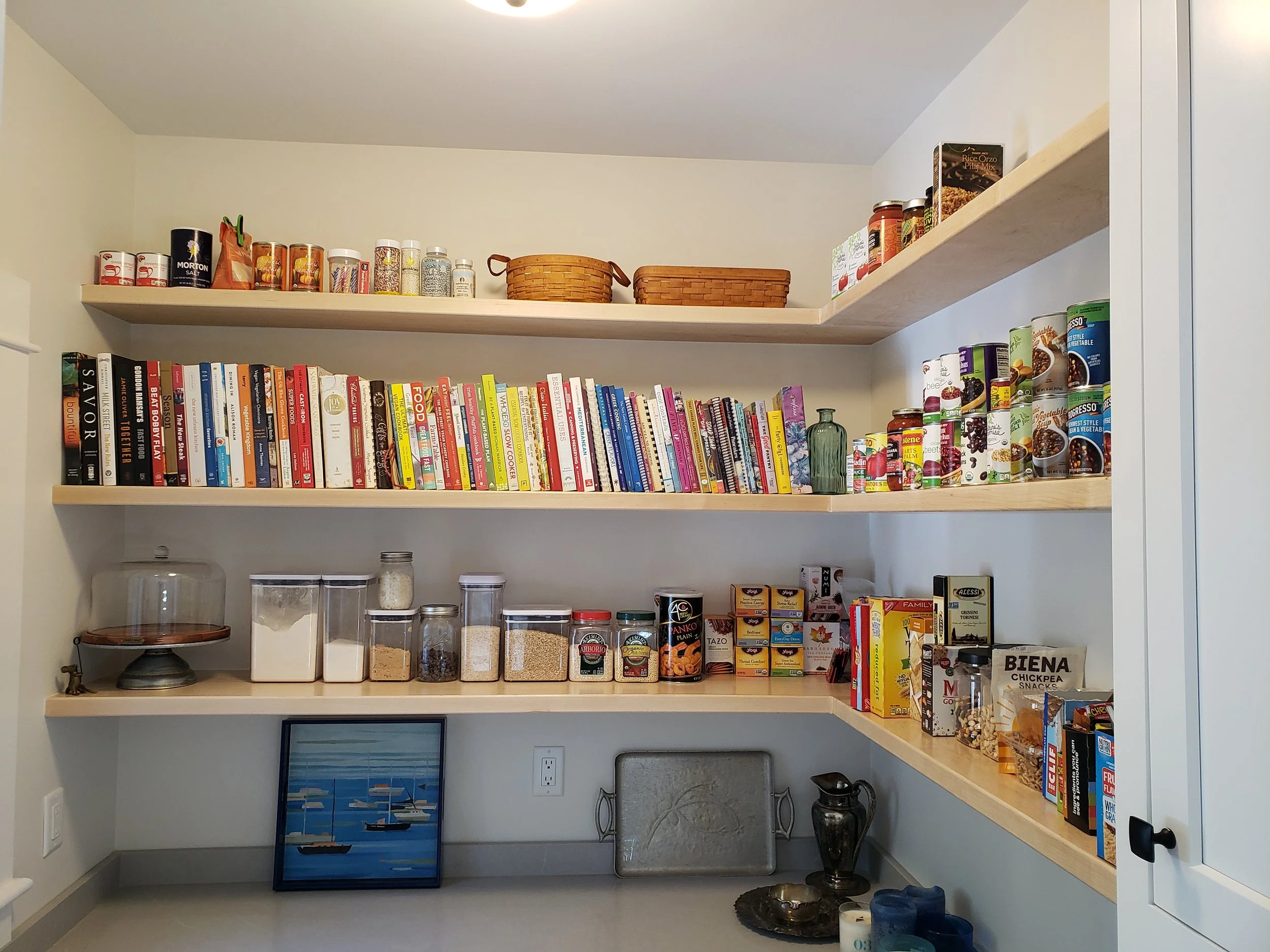 THE EXISTING RED OAK FLOORS WERE SANDED AND THE COLOR LIGHTENED, WHICH LEADS YOUR EYE INTO THE TRANSFORMED PANTRY WITH EXCEPTIONAL STORAGE OPPORTUNITIES.